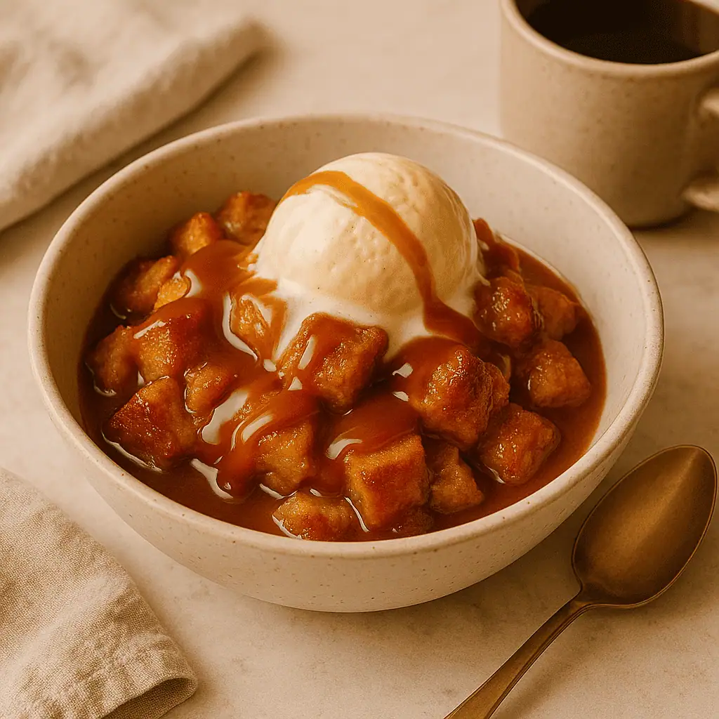Day-old bread gets a second life in this cozy dessert, baked with custard and drizzled with caramel sauce.