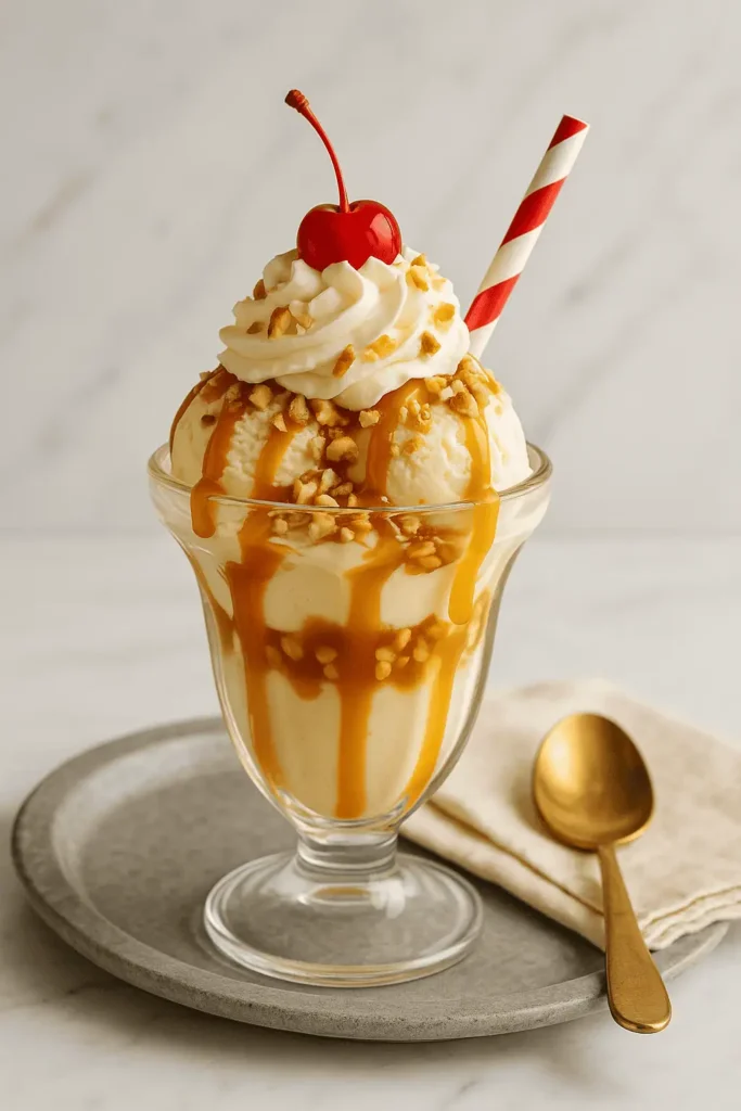 Sometimes the simplest is the best: vanilla ice cream, warm caramel sauce, and a cherry on top. Pure nostalgia in a bowl.