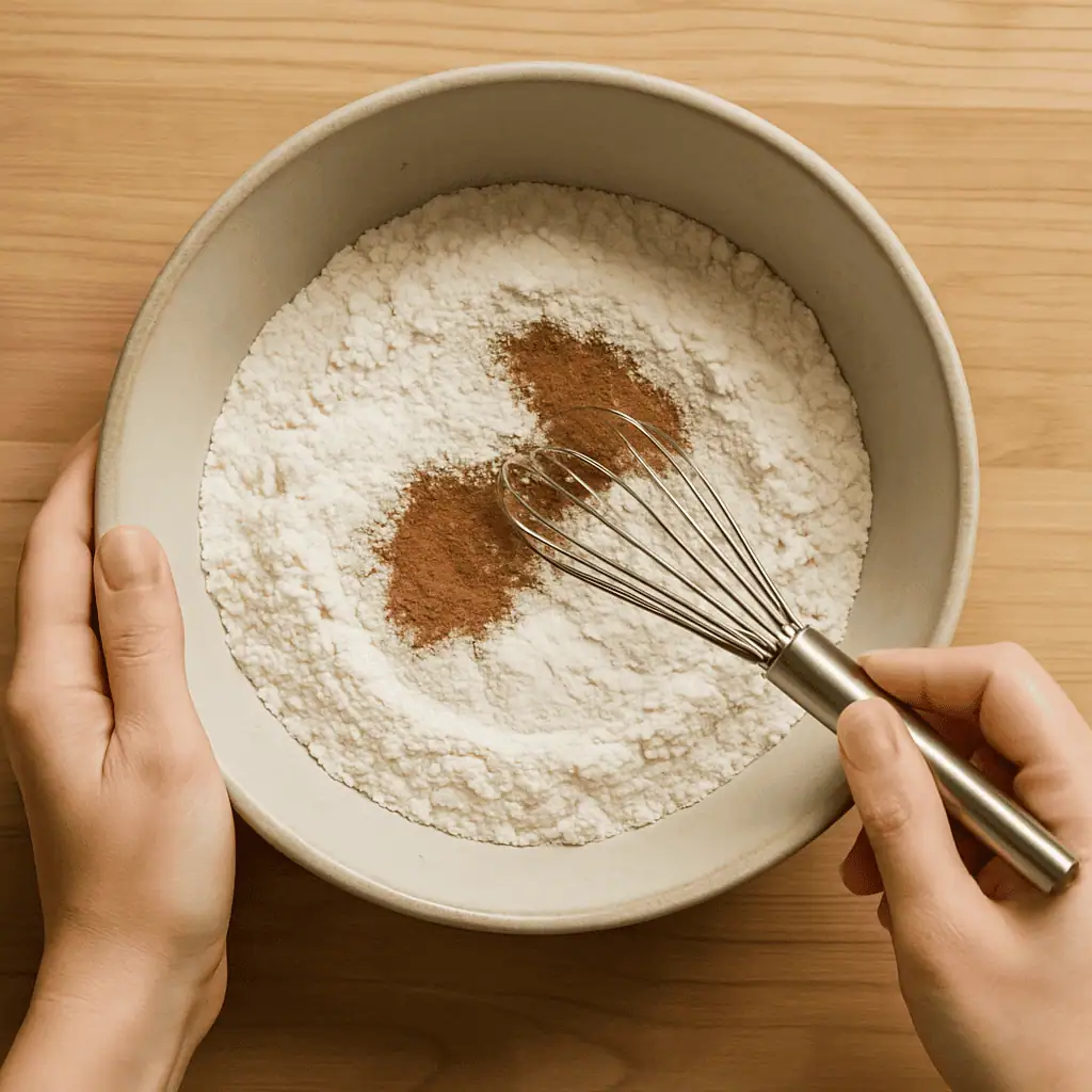 - Mix dry ingredients: In a large bowl, whisk flour, baking powder, baking soda, cinnamon, nutmeg, and salt.