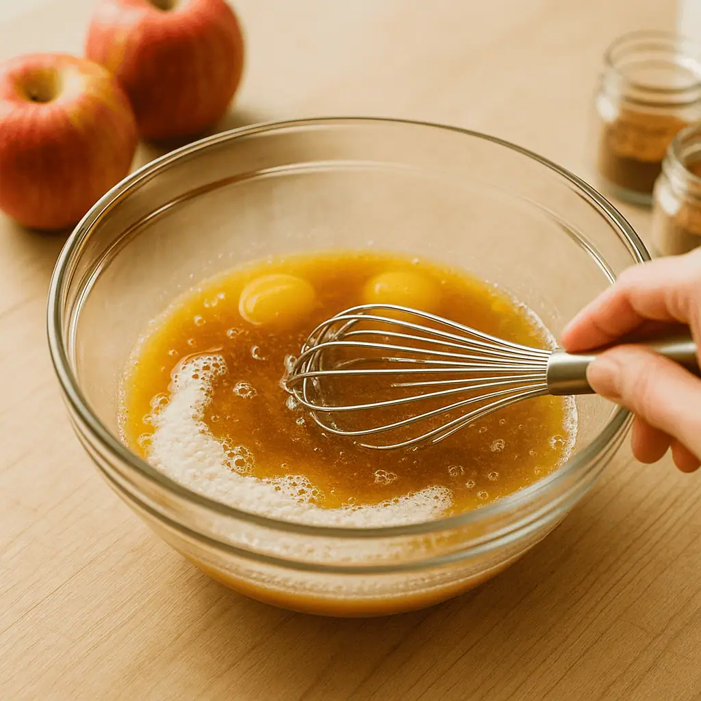 4. Mix wet ingredients: In another bowl, whisk melted butter, brown sugar, granulated sugar, eggs, milk, vanilla, and cooled cider reduction.
