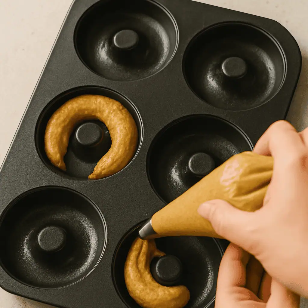 - Fill pan: Spoon batter into a zip-top bag, snip the corner, and pipe into the greased doughnut pan.