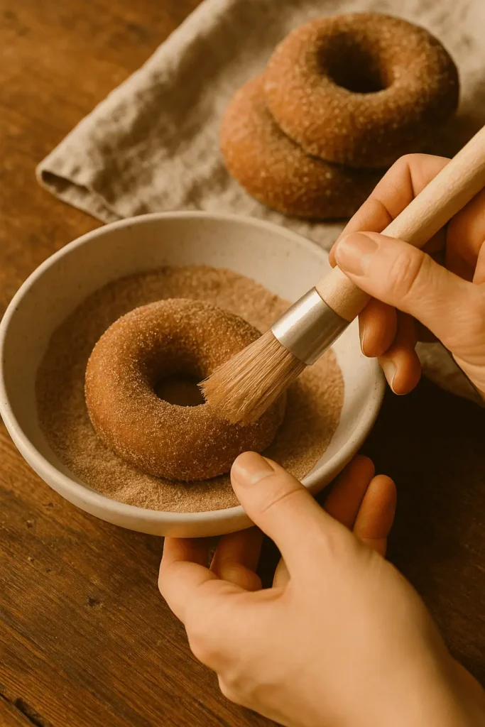 9. Coat: While still warm, brush with melted butter and toss in cinnamon sugar.