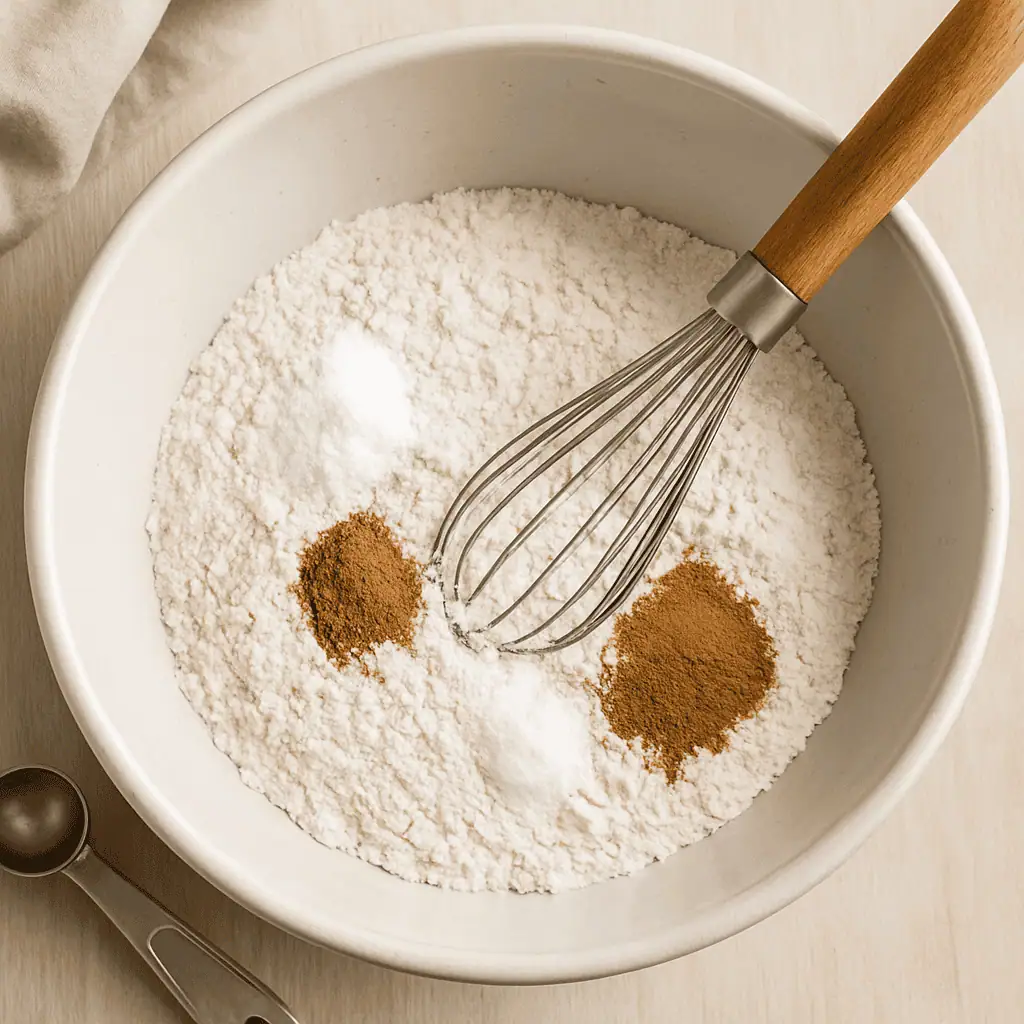 - Mix dry ingredients: In a large bowl, whisk flour, sugars, baking powder, baking soda, cinnamon, and salt.