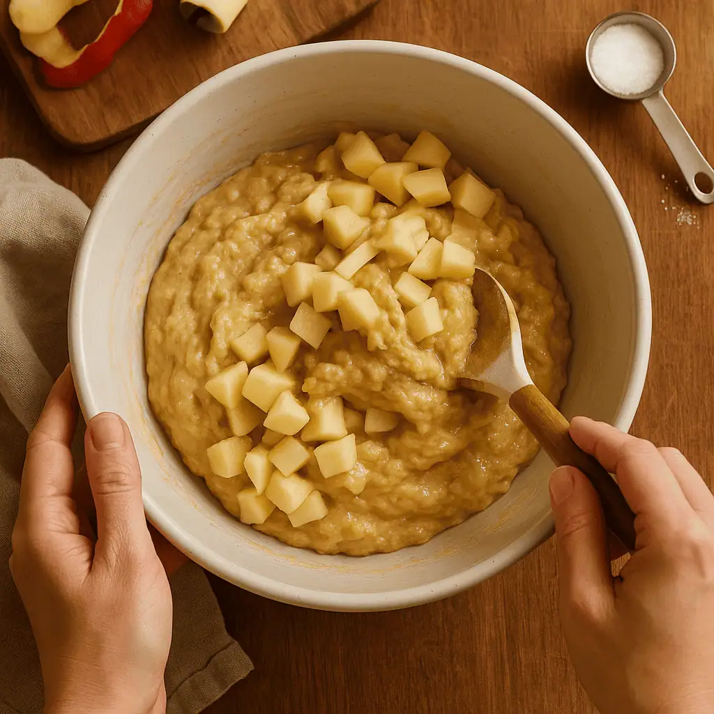 4. Combine: Add wet to dry ingredients and stir gently. Fold in diced apples.