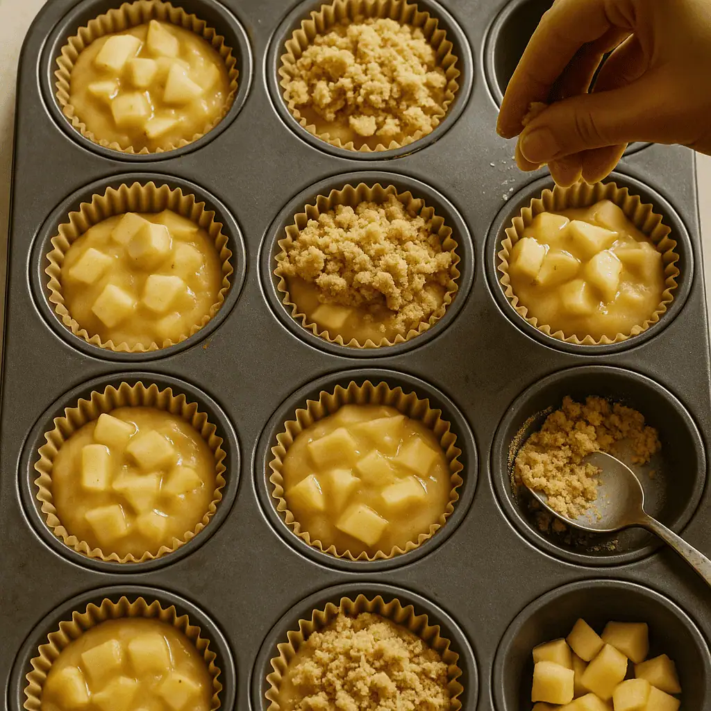 - Assemble muffins: Fill muffin cups 3/4 full. Top each generously with crumb topping.