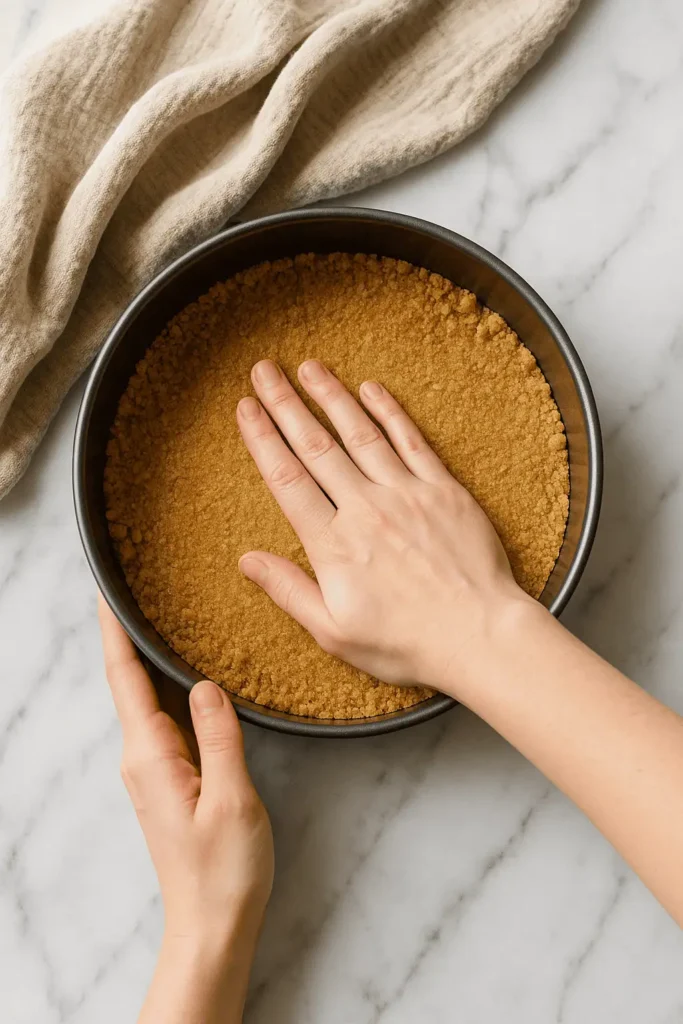 - 2️⃣ In a bowl, mix graham crumbs, sugar, and melted butter. Press firmly into the bottom of the pan. Bake for 8–10 minutes, then cool slightly.