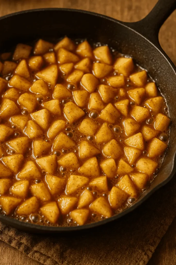 3️⃣ In a skillet over medium heat, cook apples with butter, brown sugar, cinnamon, and nutmeg until just tender (5–7 minutes). Set aside to cool.