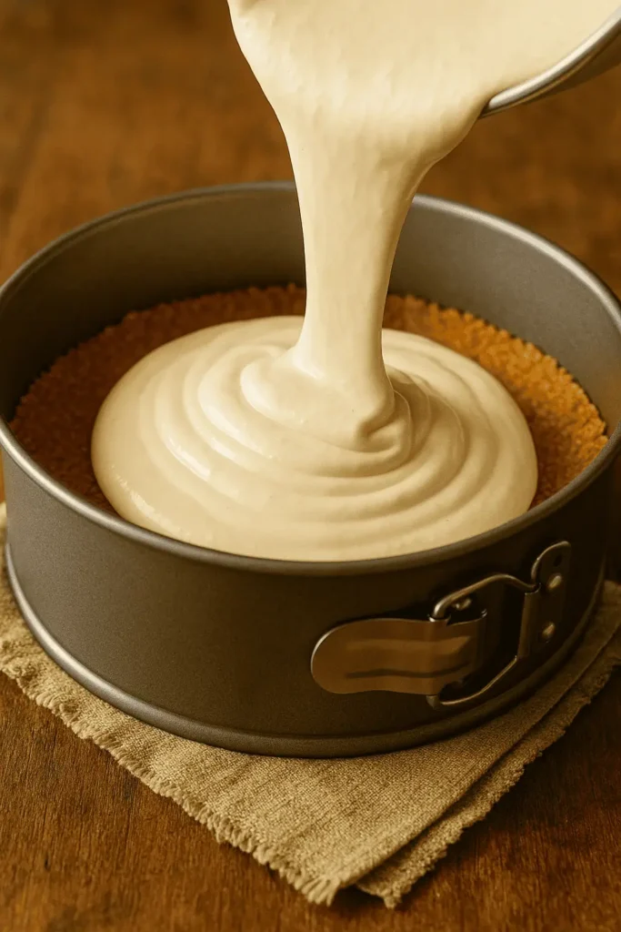 6️⃣ Bake for 50–60 minutes, until center is almost set but still slightly jiggly. Turn off oven, crack door, and let cheesecake cool inside for 1 hour.
