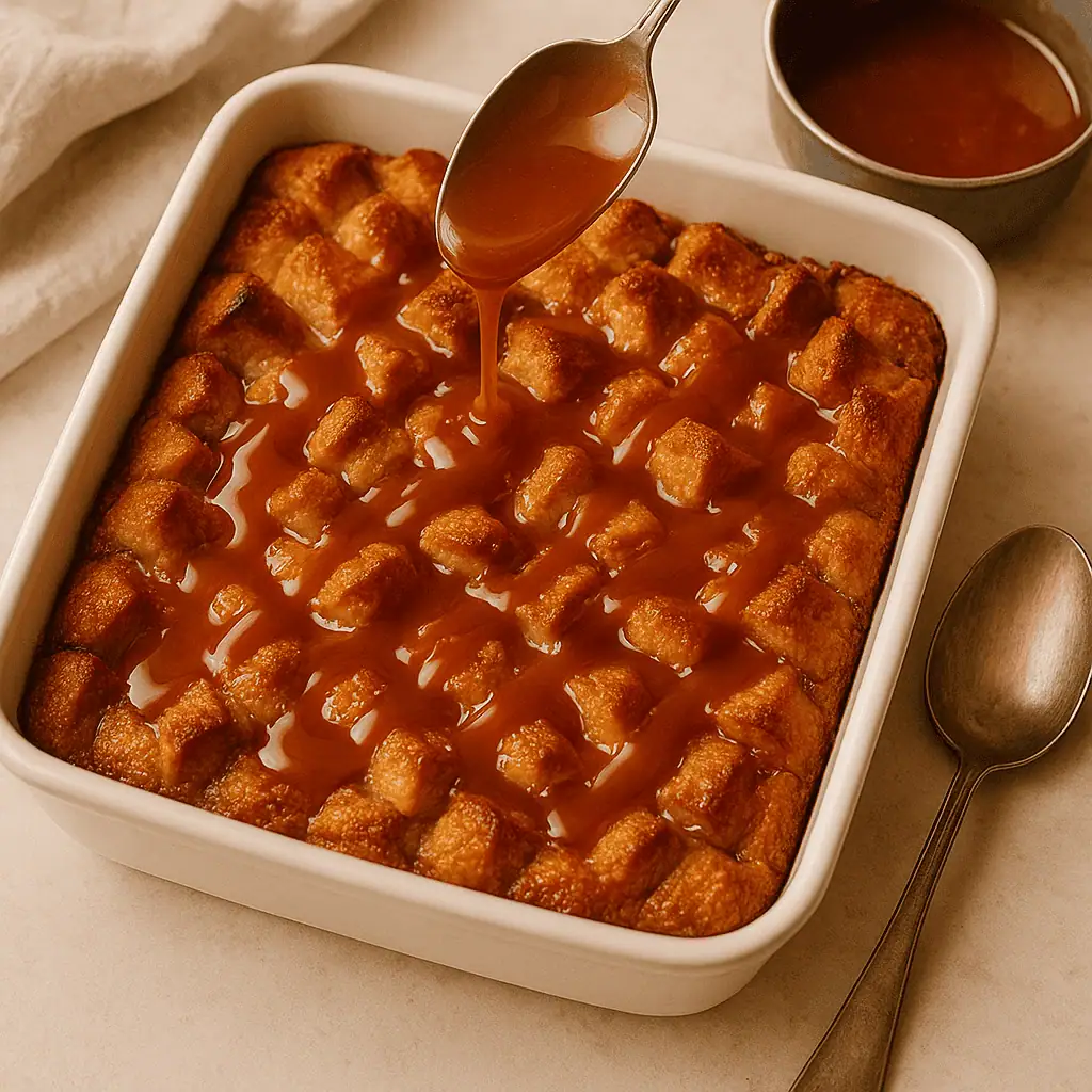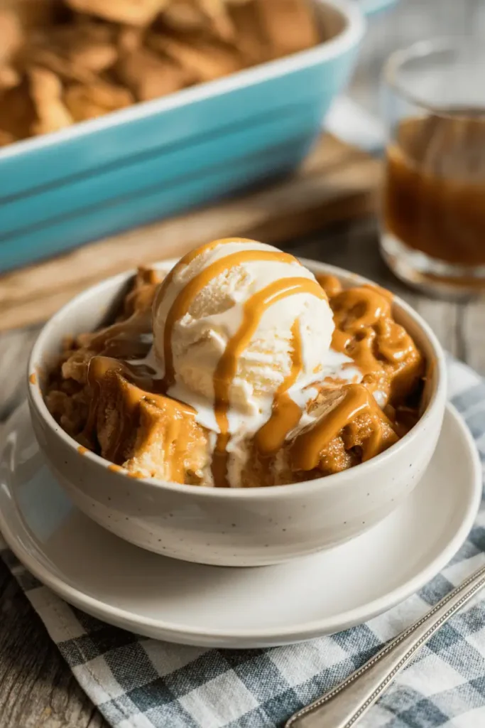 5. Serve: Spoon warm pudding into bowls, drizzle generously with caramel sauce. Optional: add vanilla ice cream or whipped cream on top.