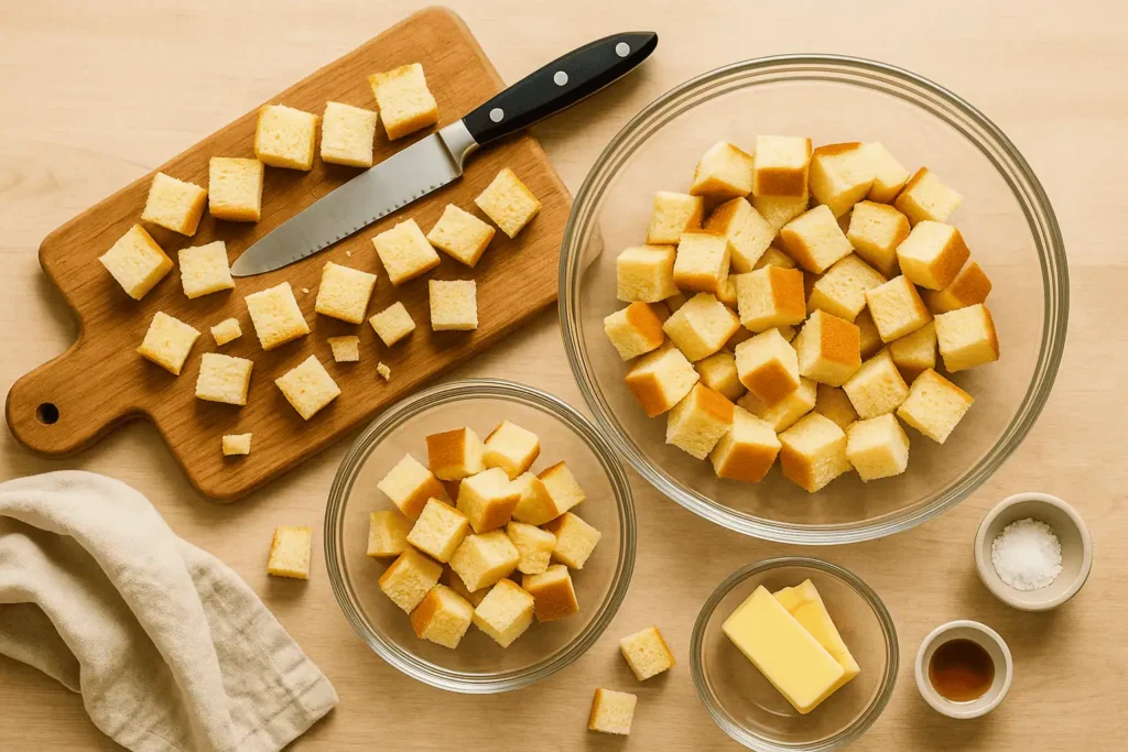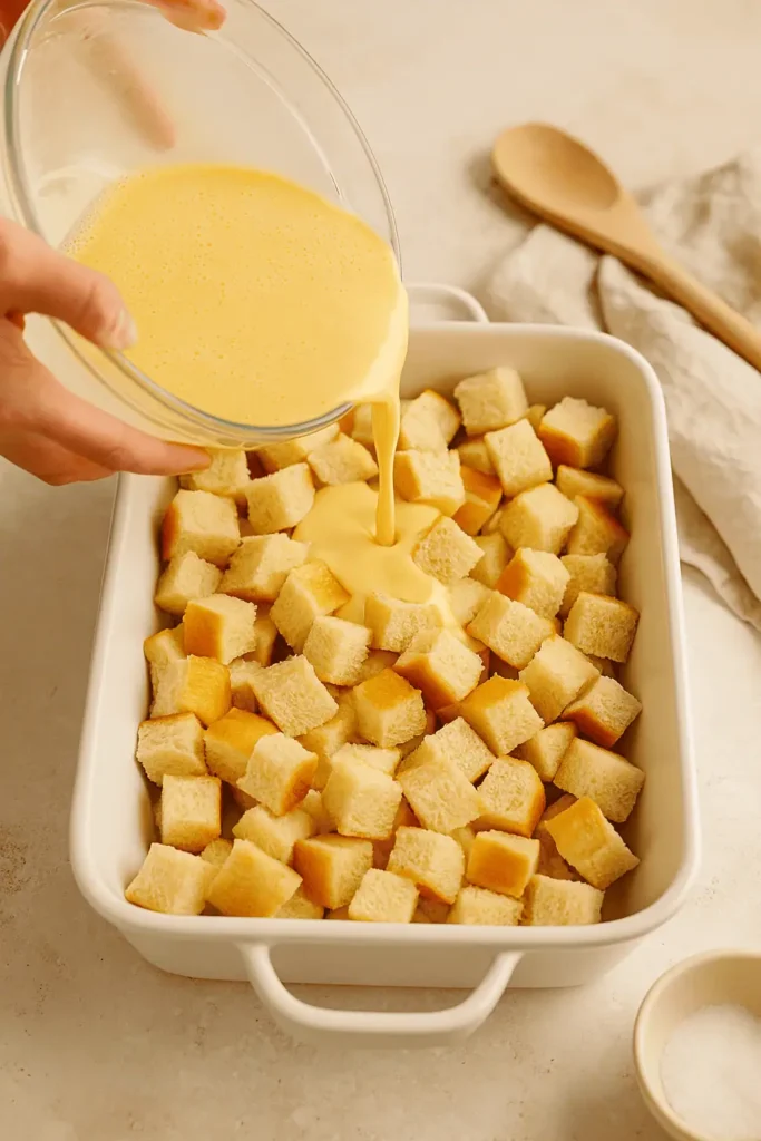 - Prep: Preheat oven to 350°F. Grease a 9×13-inch baking dish. Place cubed bread inside.