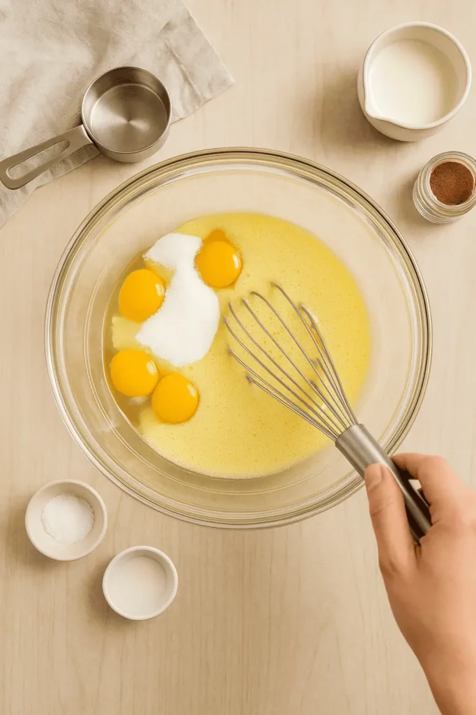 - Make custard: In a large bowl, whisk together eggs, milk, cream, sugar, vanilla, cinnamon, and salt. Pour evenly over bread. Let sit 15 minutes to soak.