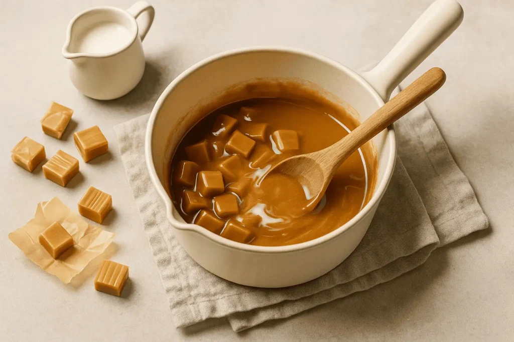 - Melt the caramel: In a heatproof bowl, microwave caramels and cream in 30-second bursts, stirring until smooth.