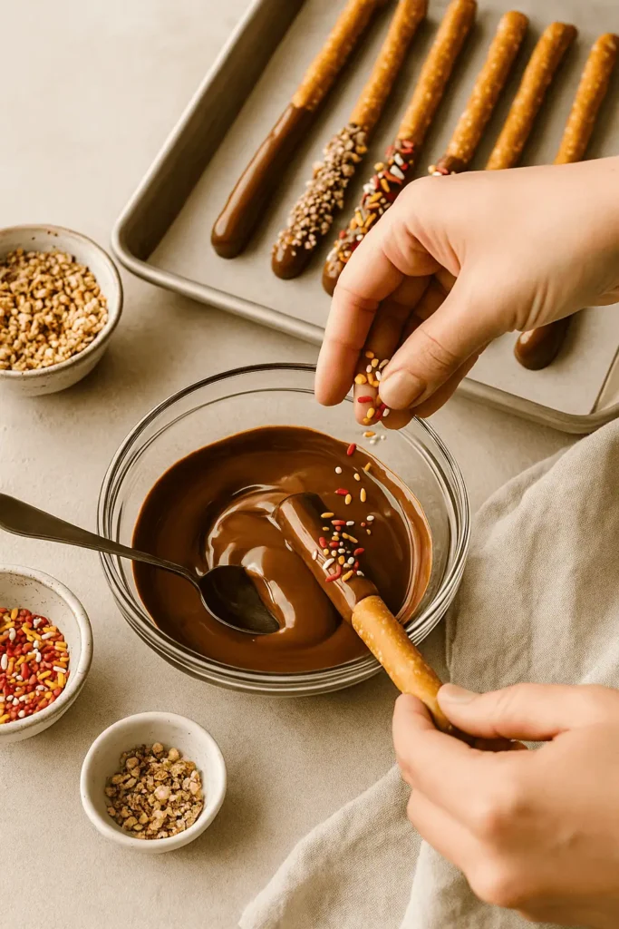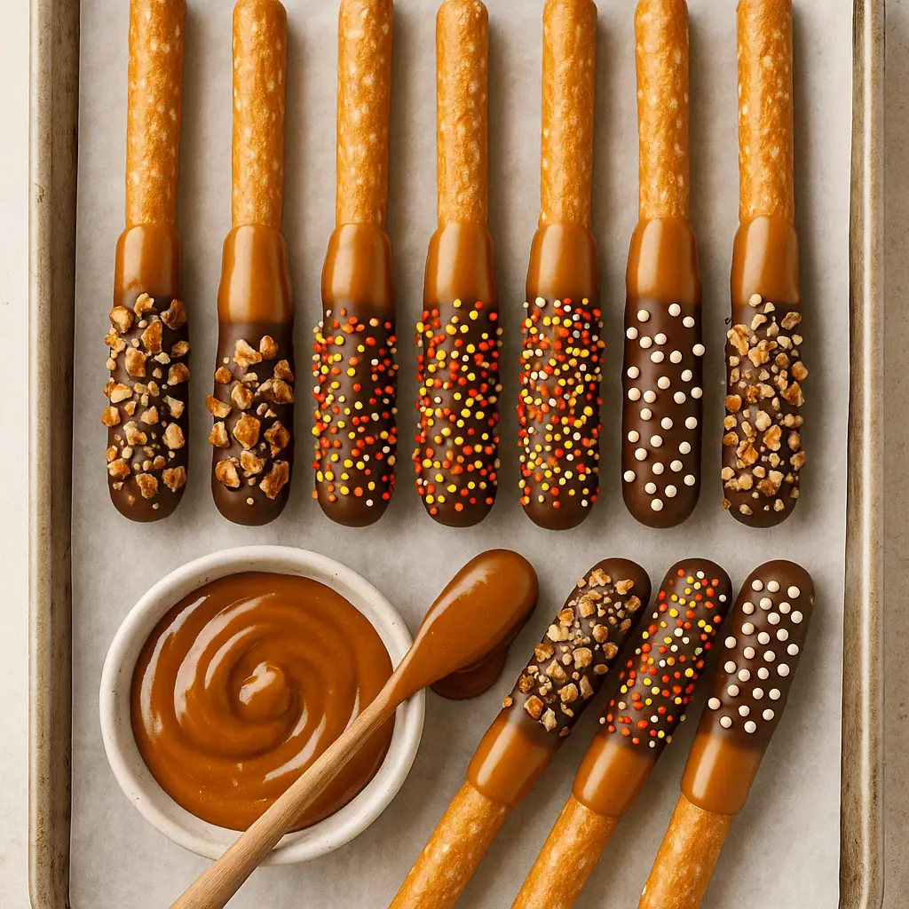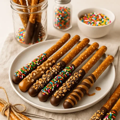 Imagine: crisp, salty pretzel rods wrapped in chewy golden caramel, then dipped in chocolate and dressed up with sprinkles, crushed nuts, or a drizzle of white chocolate. It’s the kind of snack you make once… and then every week forever.