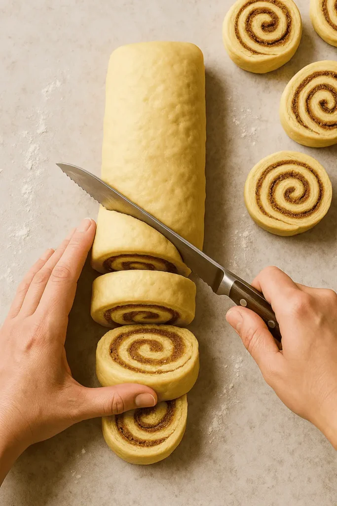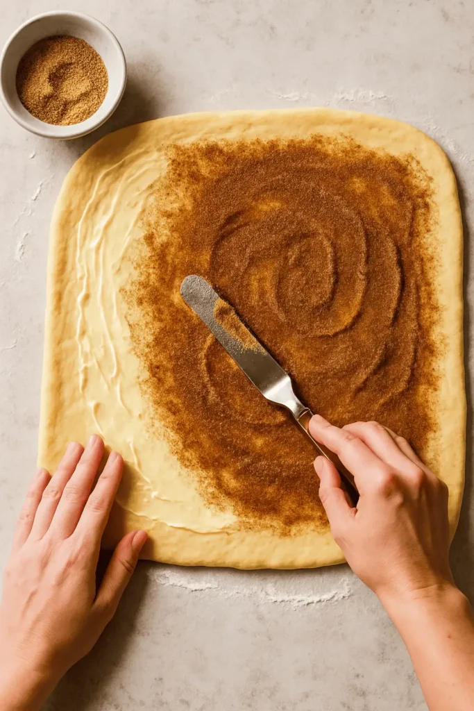 3. Roll out dough into a 14×9-inch rectangle. Spread with softened butter, sprinkle with brown sugar and cinnamon. Roll up tightly from the long side and slice into 12 rolls.