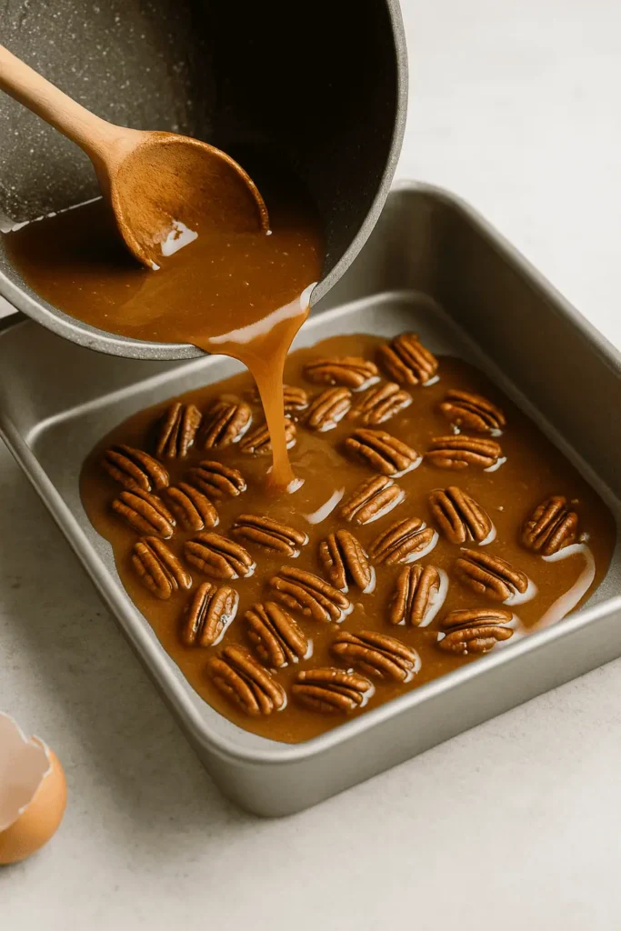 - Make topping: simmer butter, sugar, cream, and salt 3β4 mins. Stir in vanilla, pecans. Pour into greased 9×13 pan.