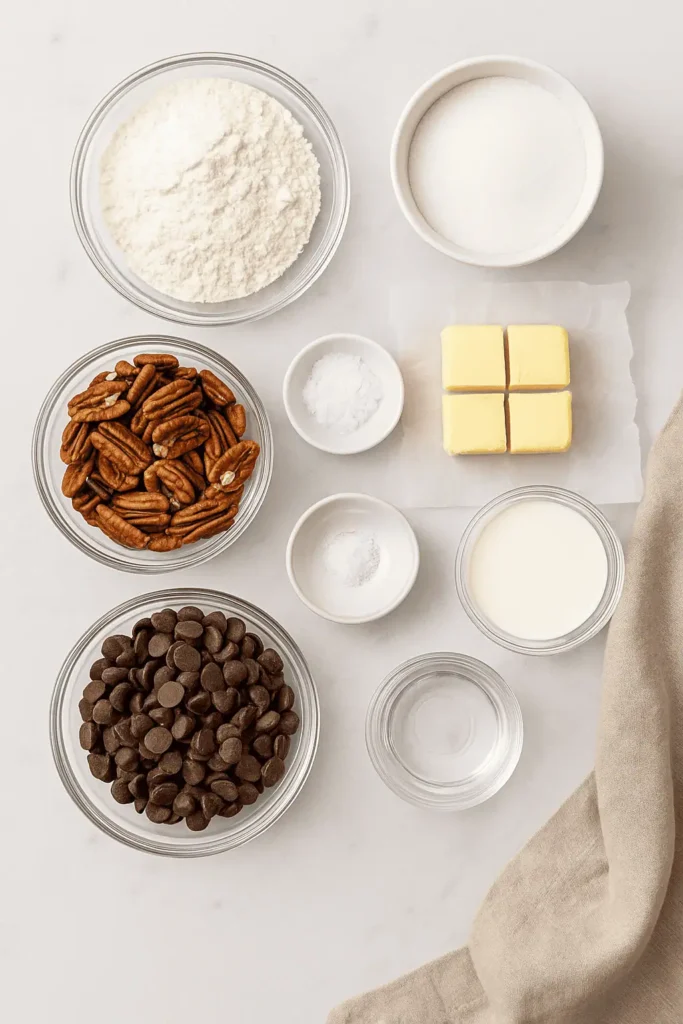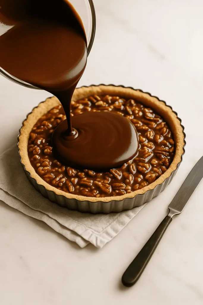 - Ganache topping: Heat cream until steaming, pour over chocolate chips in a bowl. Let sit 2 minutes, then stir until smooth. Pour over caramel pecan layer, smoothing with spatula.