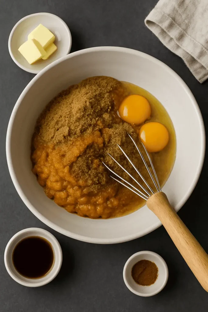 - Make the pumpkin batter: In a separate bowl, whisk together pumpkin puree, egg, brown sugar, spices, salt, and flour until smooth.