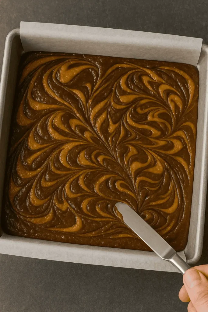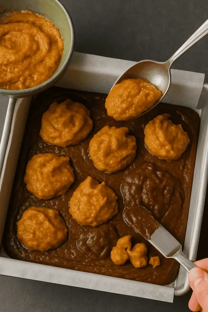 - Gently spoon pumpkin batter on top. Add remaining brownie batter in dollops.