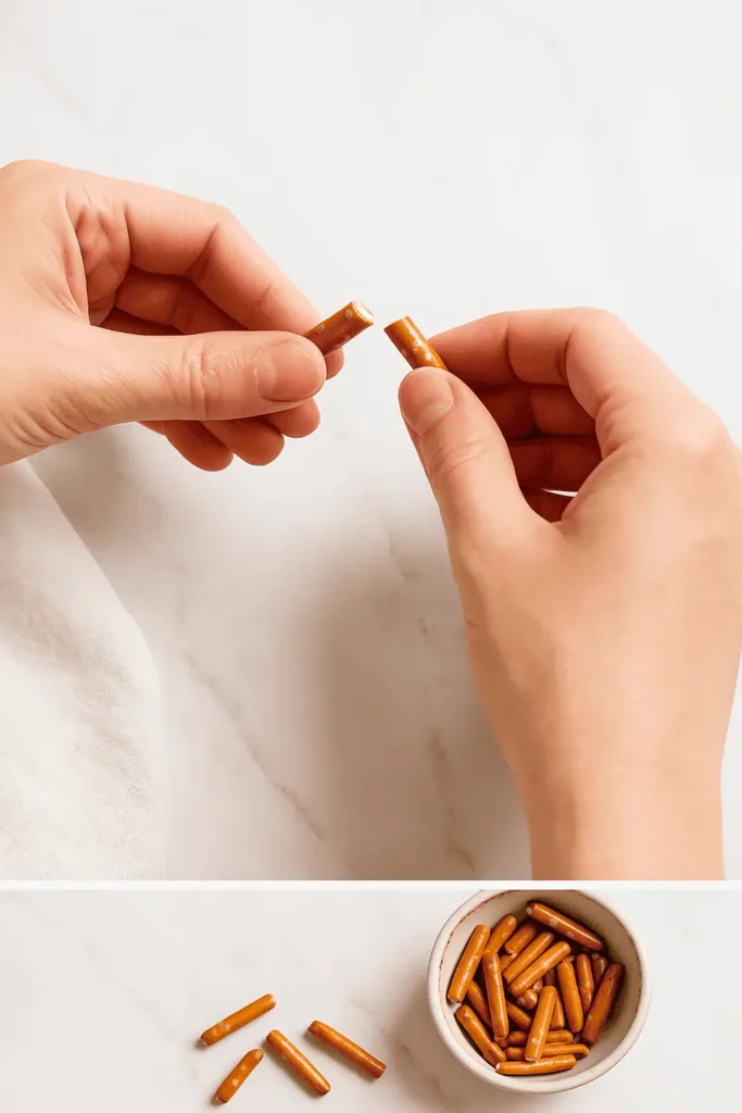 - Pretzel legs breaking? Twist gently while inserting, or dip in chocolate for strength.