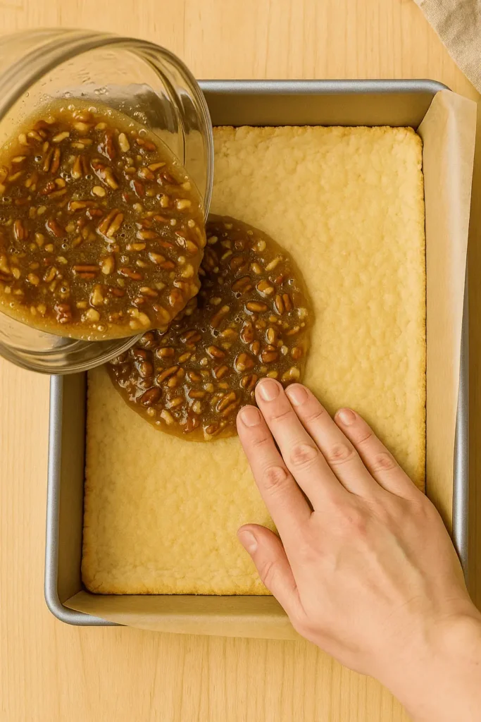 Pour filling over warm crust and spread evenly. Bake for 30–35 minutes more, until set and golden. The center may still jiggle slightly but will firm as it cools.