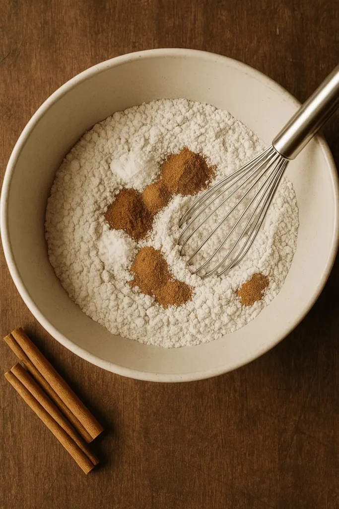 - Make the cake: In a medium bowl, whisk flour, baking powder, baking soda, salt, and spices.
