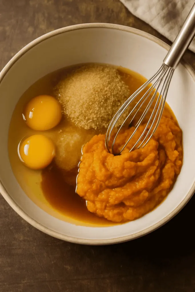 - In a large bowl, whisk sugars, oil, eggs, pumpkin puree, and vanilla until smooth.