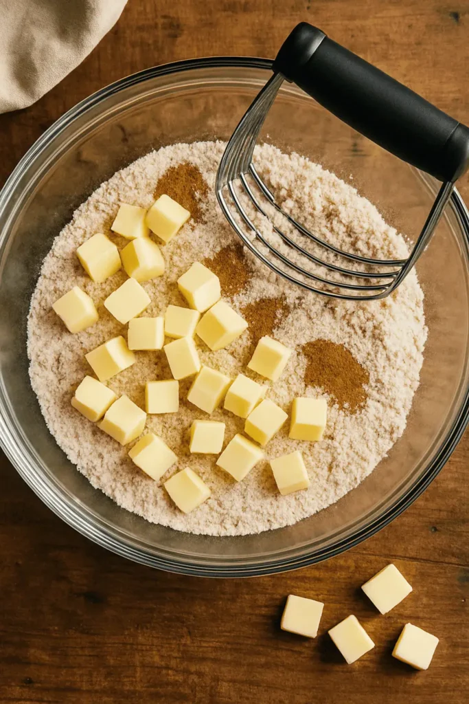 - Make the crumb topping: In a bowl, mix flour, both sugars, cinnamon, and salt. Cut in the cold butter with a pastry cutter or fork until crumbly. Set aside.