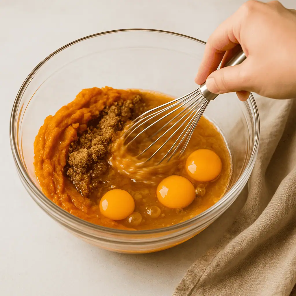 - In a large bowl, whisk pumpkin puree, brown sugar, oil, eggs, and vanilla until smooth.