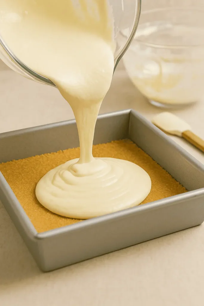 - Make the crust: In a bowl, mix graham cracker crumbs, sugar, and melted butter. Press into pan evenly. Bake 8β10 minutes. Let cool.